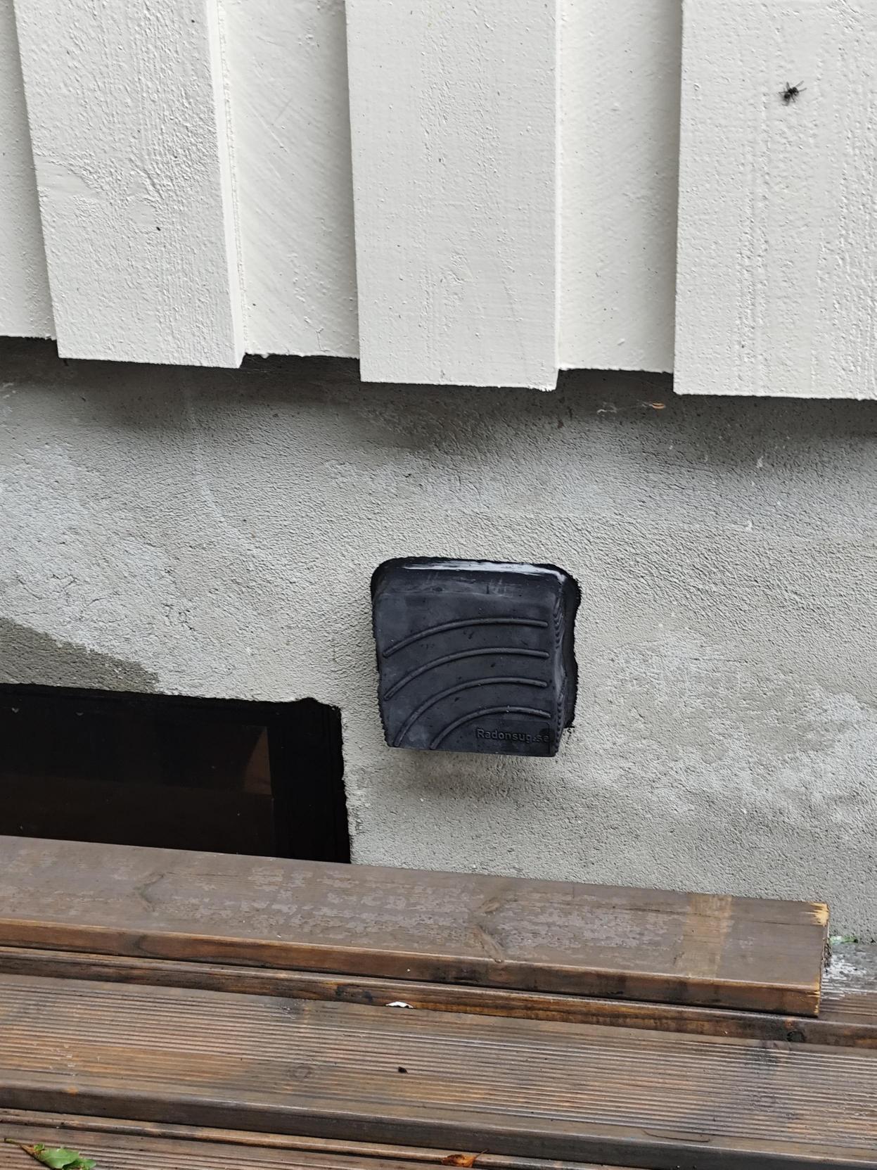 Rørene er ført videre gjennom ytterveggen og koblet til en utvendig vifte. Viften trekker radongassen ut fra grunnen under boligen og ventilerer den trygt ut i friluft.